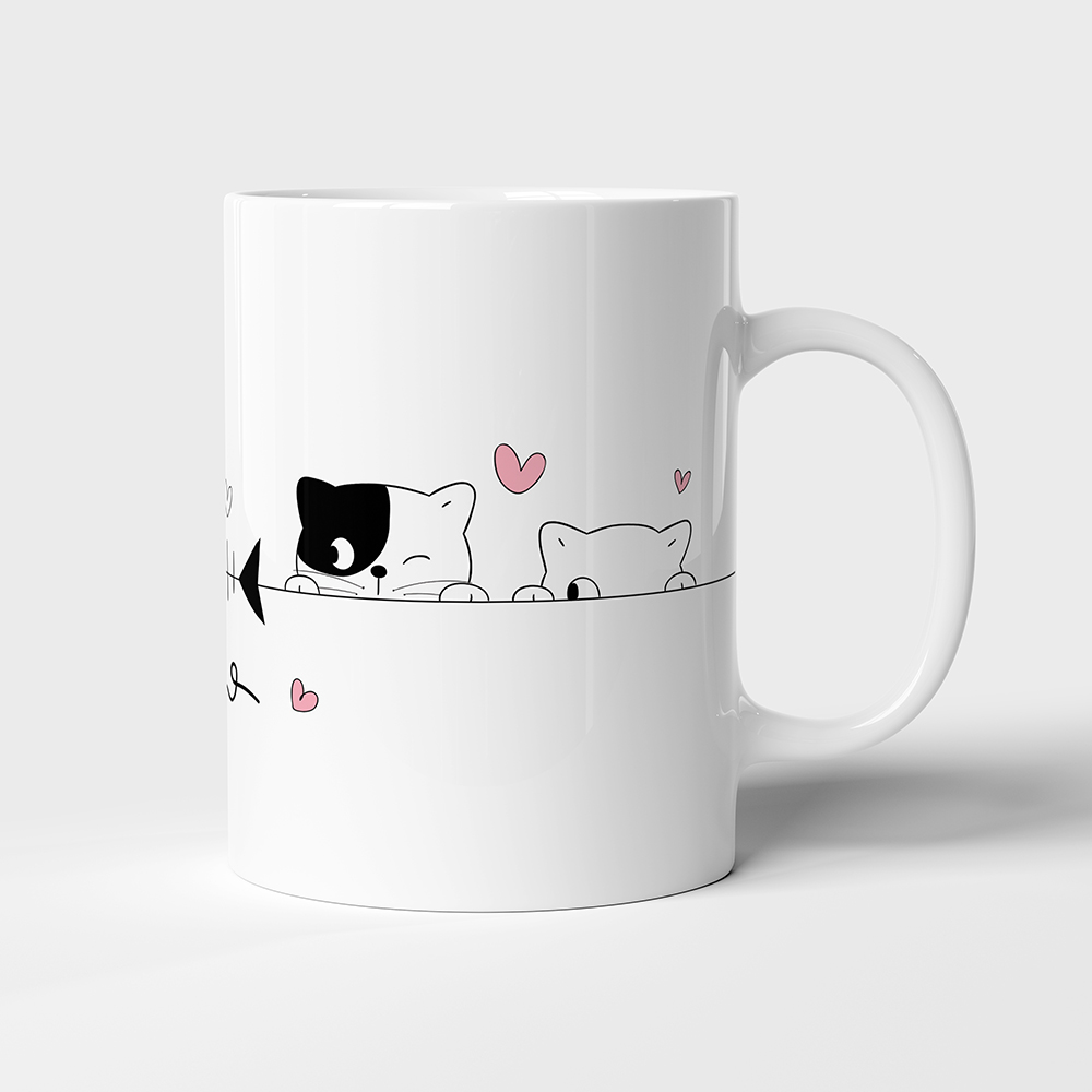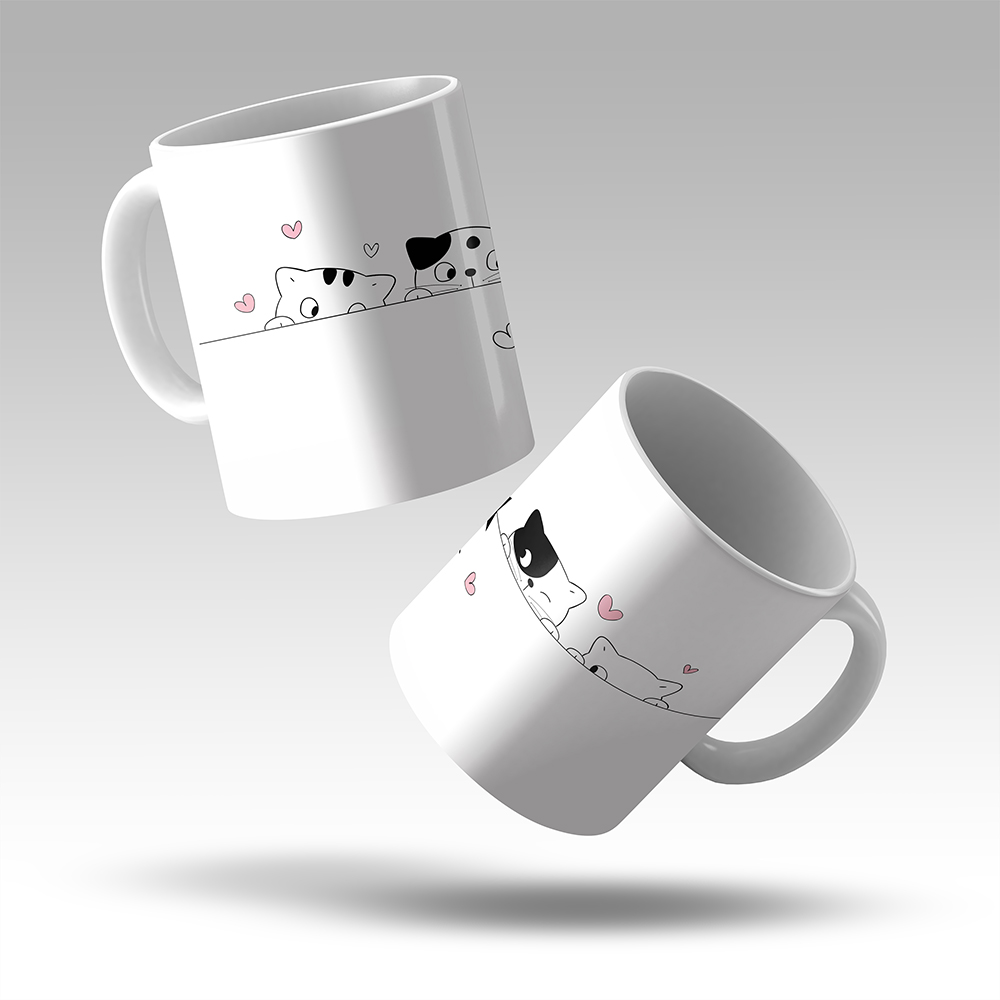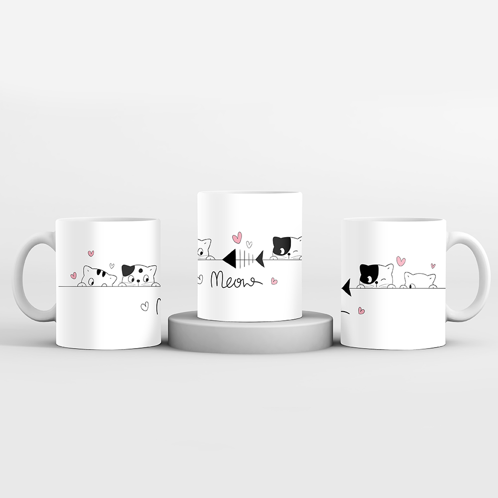 Cană ceramica cu interior alb si model grafic cu Pisici „Meow”, diametru 83 mm, inaltime 98 mm, volum 380ml (11 oz), greutate 330 g, cutie individuala.